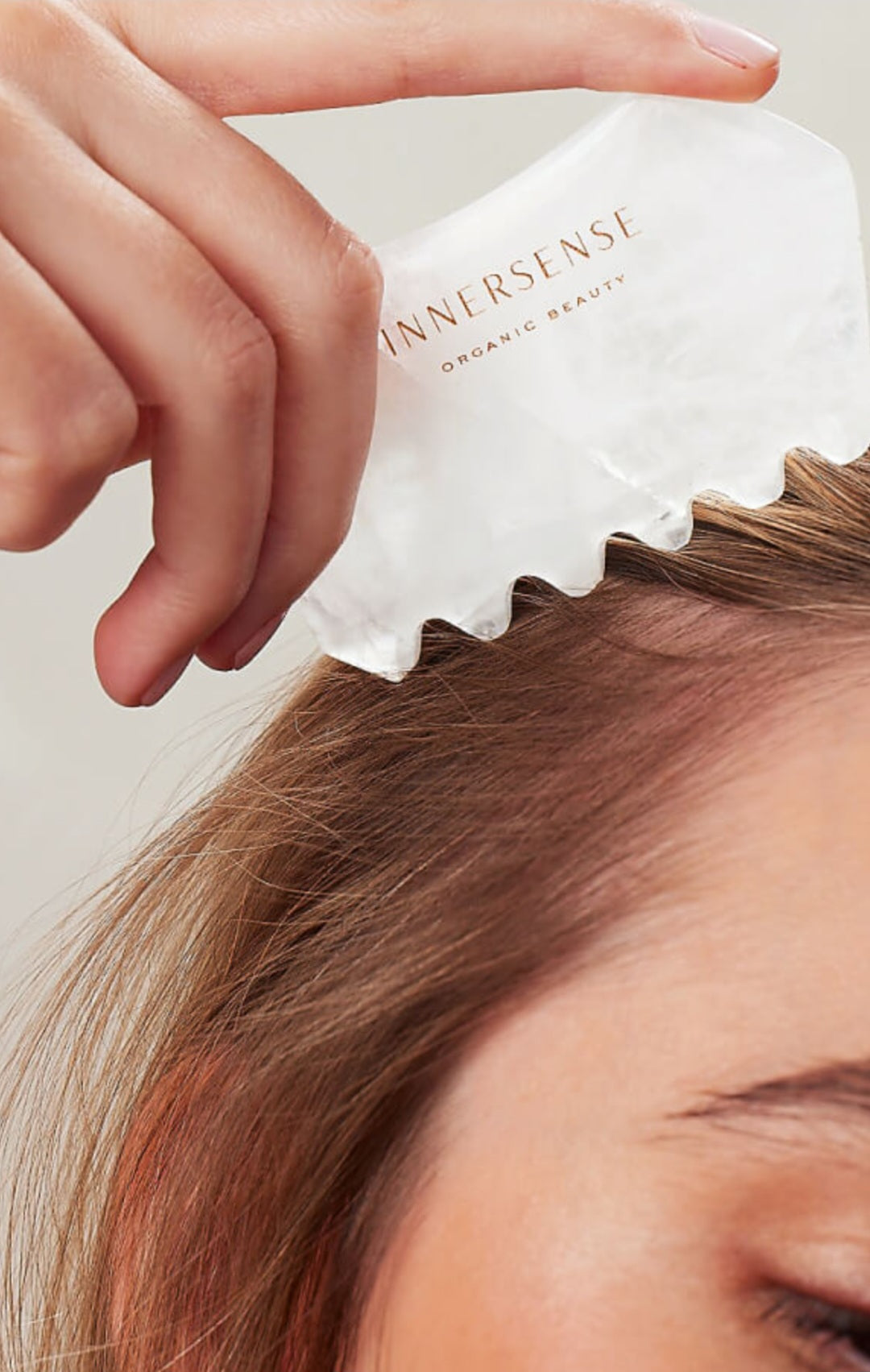 Exfoliate, soothe and massage the crown to noticeably reduce flaking, relieve dryness and encourage a balanced environment for hair to flourish. A natural clear quartz Scalp Massager helps improve circulation, release tension, and bring peace to mind.