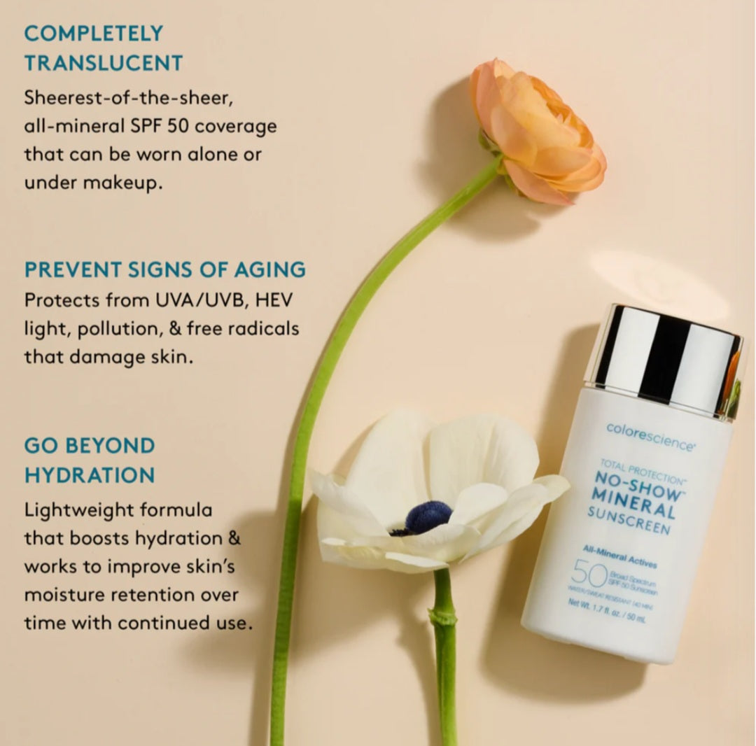 Colorescience NO SHOW Mineral SPF50 is the sheerest-of-the-sheer, all-mineral sunscreen that blends into skin so beautifully you’ll forget it’s there. Its ultra-lightweight formula combines patented non-nano zinc oxide with exceptional hydration that leaves skin feeling velvety soft while EnviroScreen® Technology provides comprehensive environmental defense from UVA/UVB, HEV (blue) light, infrared light, free radicals, and pollution.